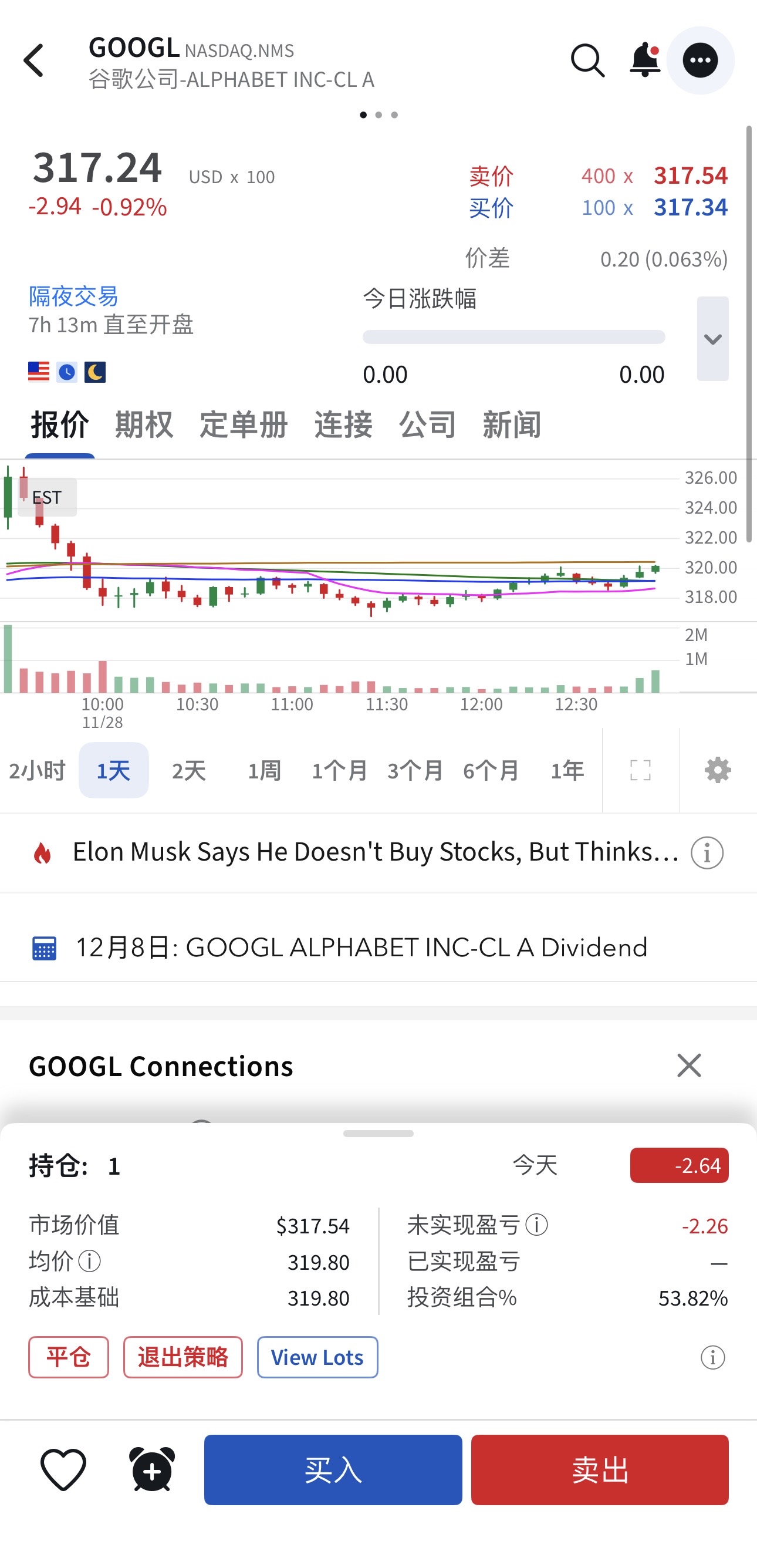 - 然后以 318.8 美元 的价格买入了 1 股 GOOGL。