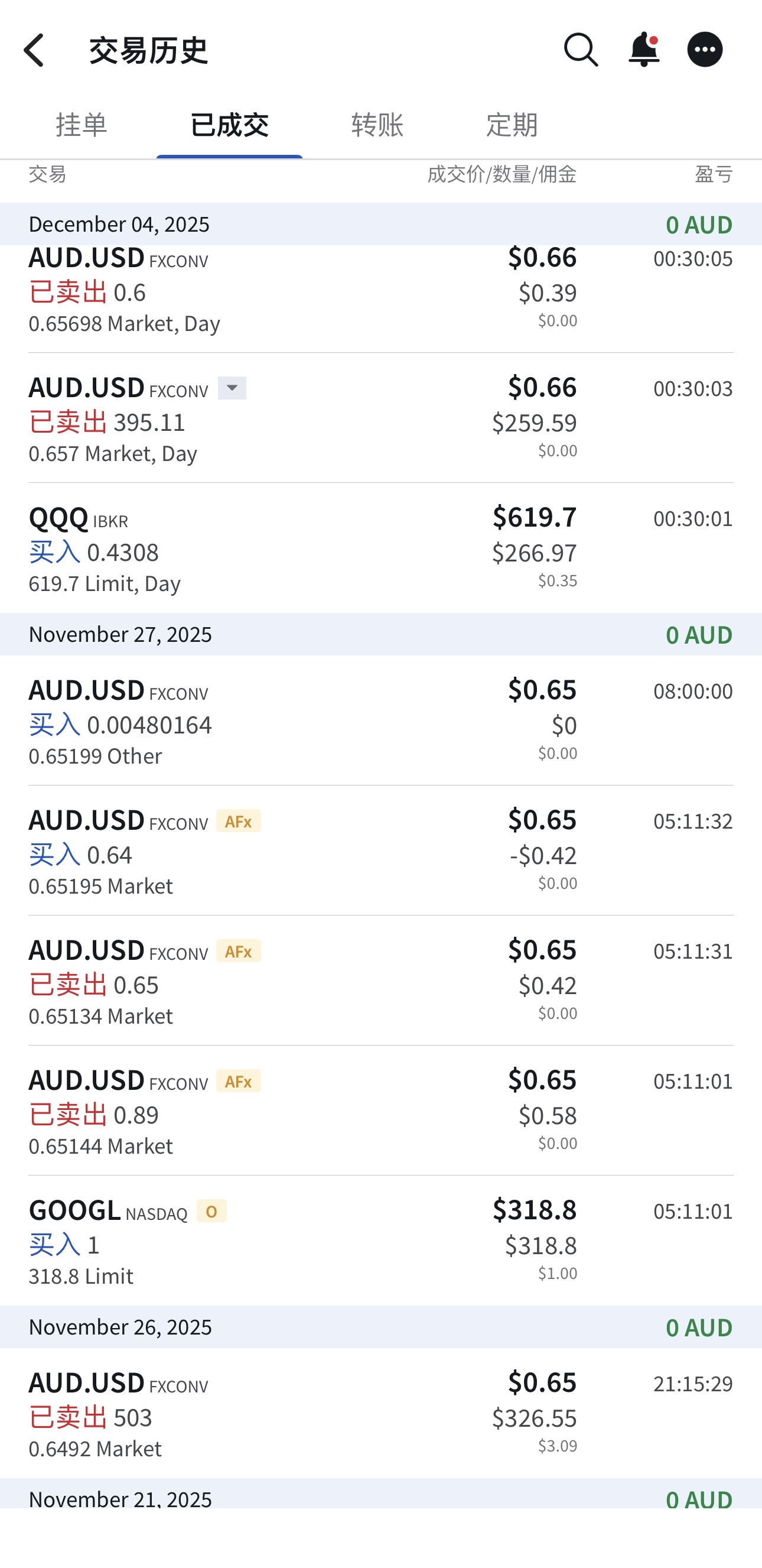 如下,可以看到我之前的交割单,手动换汇吃相太难看,我这次用澳币买QQQ,系统自动帮我换了,好像没要钱。